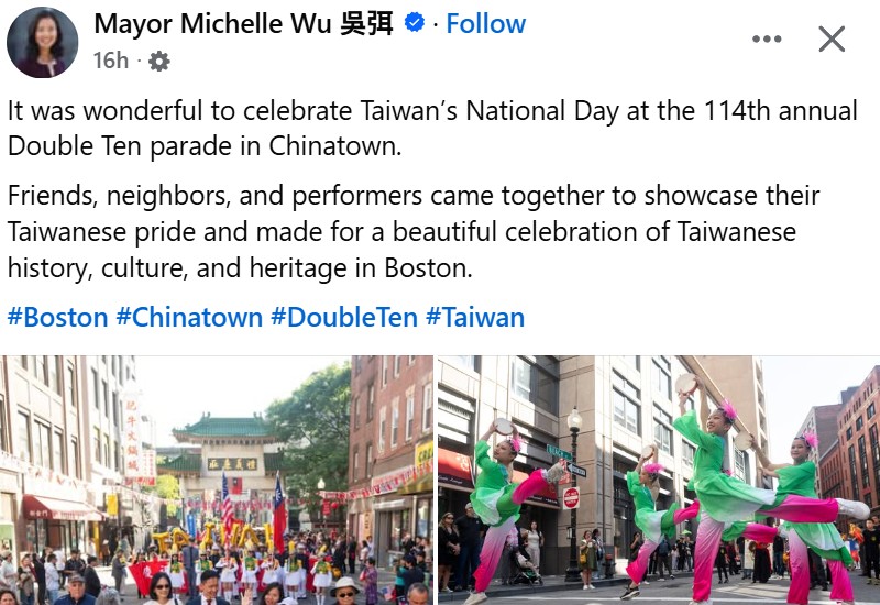 領導Boston市抵抗川普霸凌的Boston市長Michalle Wu 吳弭(前排右5),上周親自加人在該市ChinaTown的Boston市慶祝雙十節Parade。 Michelle Wu在她的FB上,曬出她抱著她的baby,興高采烈,走在隊伍的前頭的照片。 Michelle Wu 在FB的簡訊,寫到:Boston各界朋友,左鄰右舍,及許多表演者,集聚在一起,來展示台灣的榮光,令在Boston慶祝台灣歷史文化傳統的活動,更優美。 Michelle Wu 是美國大都市少數親自公開出席慶祝雙十節的市長。(圖取自 Michelle Wu的 FB)